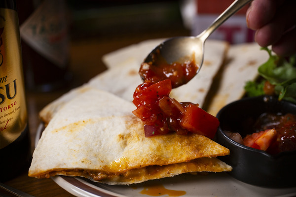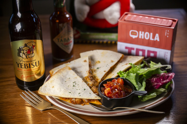 普通の雑居ビルを上がるとそこはアメリカの雰囲気が広がる「NewVillage」。店主の新里さんは沖縄出身。今回のヱビスに合わせた逸品もケサディアなのだがどこか「沖縄」を感じてしまう「沖縄アメリカン」な味付け。特に今回のソースに注目。秀逸です。