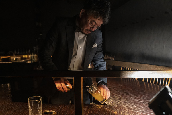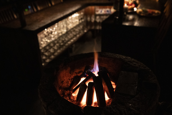 照明を極限まで落とした漆黒のように真っ暗な空間と、その店の中央に設えた炉で赤々と燃える炎が印象的なバーです。静寂に包まれた店では、炉にくべられた炭がパチパチと弾け、心地良いリズムを奏でます。