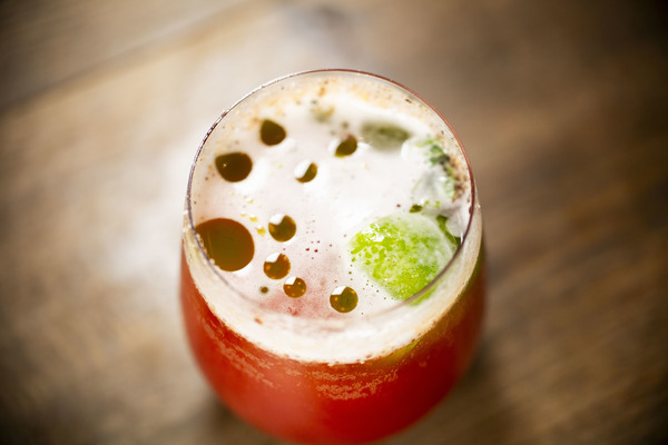 トマトジュースに自家製チキンブイヨンでコクをプラスし、ウォッカ、ライムで味を引き締め、仕上げにバジルオイルとイタリアの唐辛子ソルトで仕上げました。