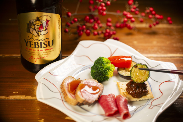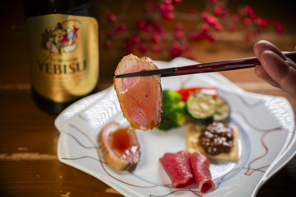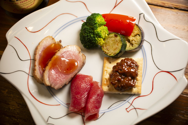 今回のヱビスビールに合わせる逸品は、鴨のロースト、鴨の生ハム、鴨の肉味噌の三種を盛り合わせた前菜です。ナスとズッキーニ、パプリカ、ブロッコリーなどの野菜も添えました。