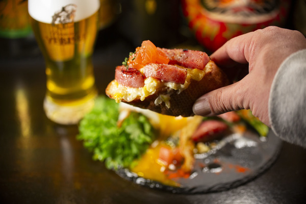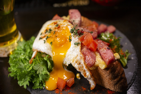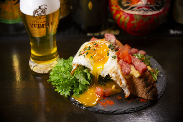 今回は【料理のコク×ビールのコク】をテーマに今までに有るようで無い料理を考案いたしました!!とうもろこしのツブツブか残りったニンニクの効くオリジナルアイオリソースをバゲットに塗りトーストで仕上げ、カリカリベーコンの用に焼いた雲仙ハムとプルプルの目玉焼きを上にのせて提供致します!!