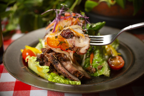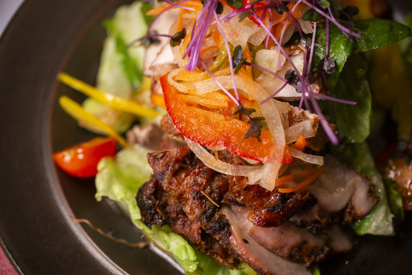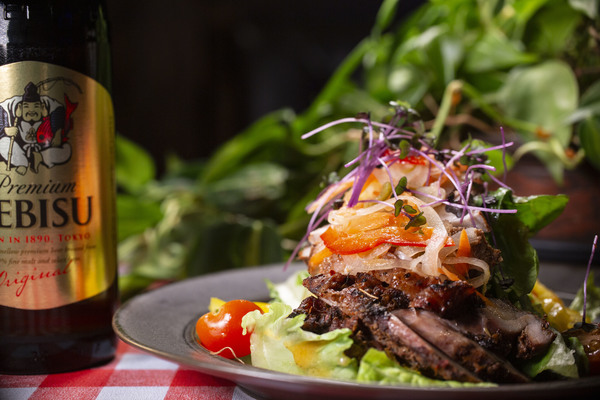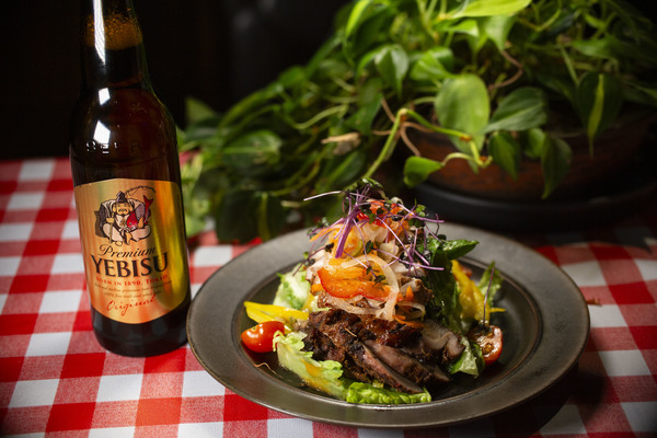 本場ジャマイカ人の作るオリジナルジャークシーズニングにチキンを最低3日は漬け込んだチキンを炭火で焼き上げスモーキーなジャークチキンにオリジナルドレッシングと木の子もジャークシーズニングで炒めこちらこサラダの上にマリネした野菜のエスカベッシュを乗せて複雑な味がしっかりとしたヱビスビールにマッチします。