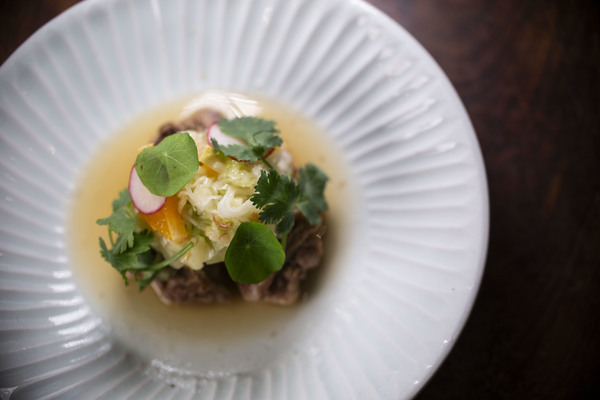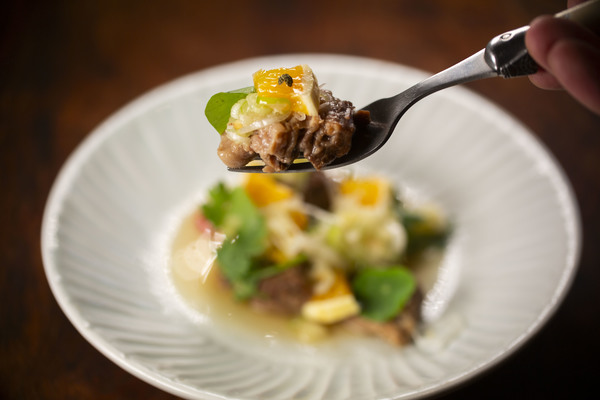 そのすね肉を低温で72時間調理しステーキと煮込みとも違う柔らかさに仕上げた。