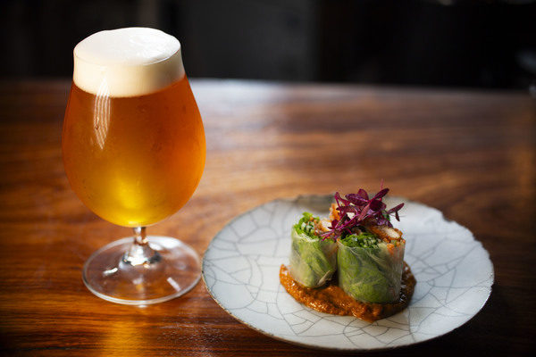 鶏肉のフリットのサクッとした食感をアクセントに、野菜との温度の対比など、さまざまな楽しみのある一皿に仕上げています。アーモンドと自家製ラー油を使用したピリ辛のロメスコソースを合わせ、華やかでフルーティーな味わいのビールとも相性抜群です。香ばしさとスパイスの香りが心地よく広がります。