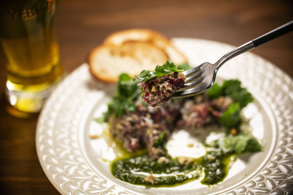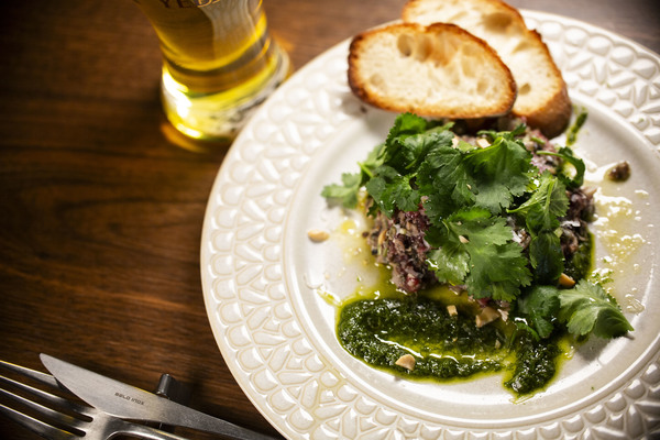 馬刺し用の赤身の馬肉と、コリアンダーシードの香りを移したオイルでコンフィにした牡蠣を叩いてタルタルステーキに仕上げてあります!