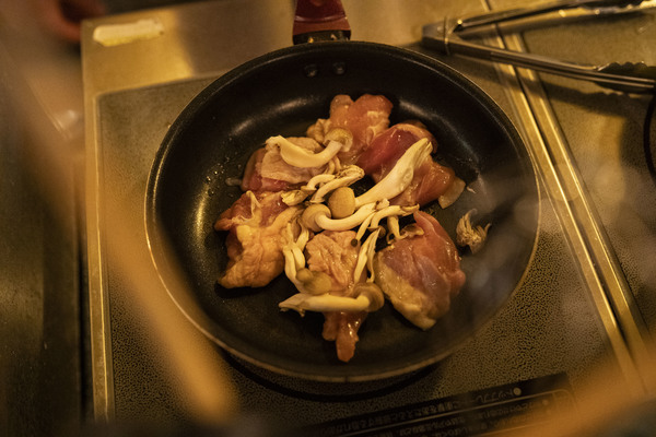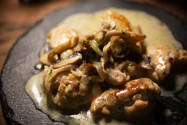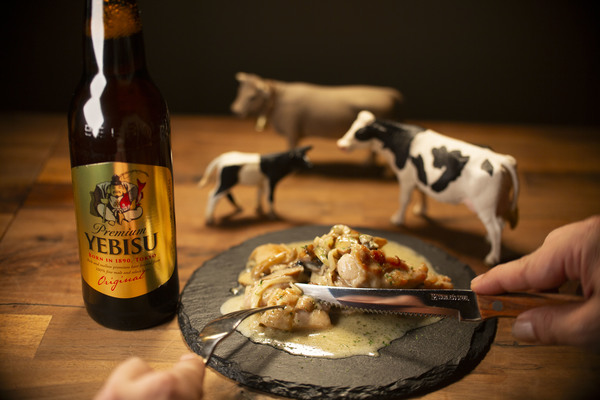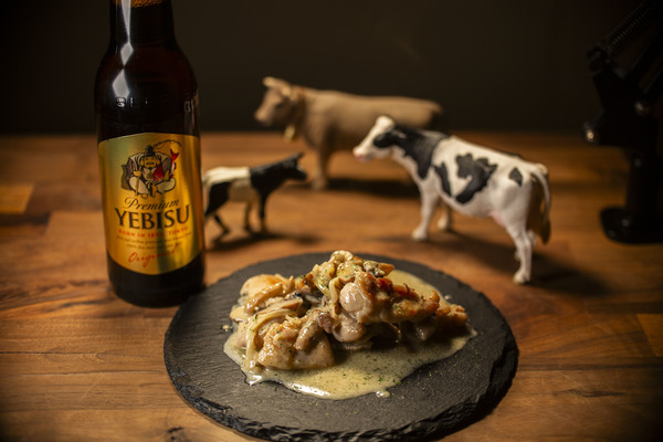 皮目は強火で一気に焼き締め、香ばしくクリスピーに仕上げた鶏もも肉に、塩味と深いコク、ほのかな青カビの刺激を感じるブルーチーズを生クリームでなめらかにのばした濃厚ソースをたっぷりと重ねました。ジューシーな肉の旨味とチーズの複雑な風味が重なり合い、ひと口ごとに奥行きのある味わいが広がります。そこに麦芽のコクと上品な苦味を備えたエビスビールを合わせることで、濃厚さを受け止めつつ後味をすっと整え、次のひと口へと自然に誘うバランスに仕上げています。ビールの旨味を引き立てるための塩味設計にもこだわった一皿です。