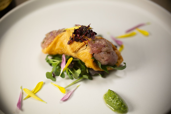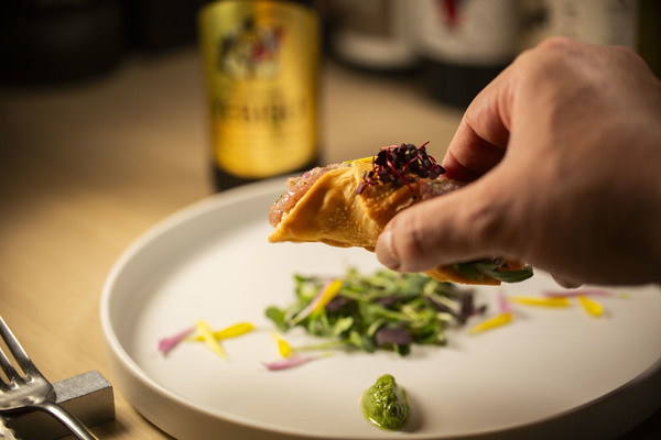 シチリアの伝統菓子「カンノーリ」をスターターの発想源に、料理として再構築したフィンガーフードです。赤身の旨みが際立つマグロを丁寧に細かく刻み、オリーブオイルと穏やかな酸味で軽やかなタルタルに仕立て、サクッと香ばしいカンノーリ風の生地に詰めました。そのまま手でかじって生地と一体感を楽しむのも、崩してタルタルとして味わうのもおすすめです。側には万能ネギの香りと柑橘の爽やかなソースを添え、マグロのコクを引き締めつつ後味はすっきりと。ビールのキレと麦の旨みを引き立てる、甘さに頼らない食事としてのカンノーリです。