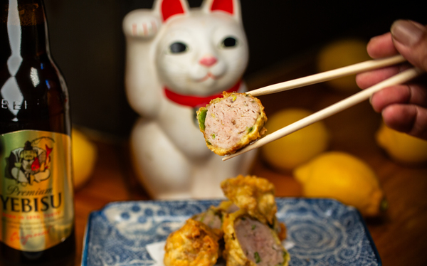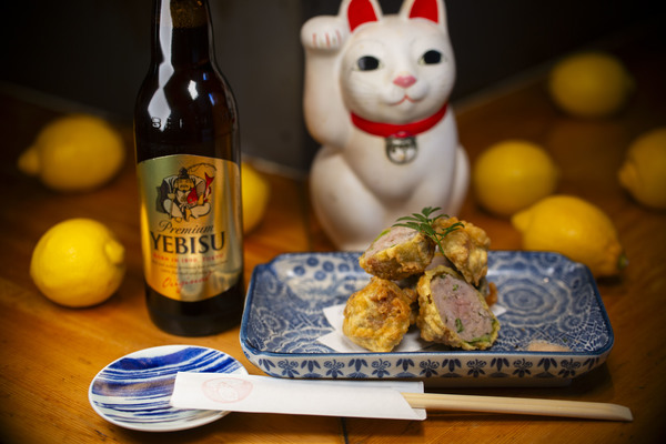 平日でも盛況な恵比寿西にある名店中の名店「おじんじょ」。料理番の文谷さんの作る創作料理はいつもどこかしっかりと季節を感じる「和」の香りがエッセンスとして入っていて今回も肉詰め天ぷらの中にはしっかりと春の苦みとさわやかな香りの「ふきのとう」がヱビスにぴったりの味。