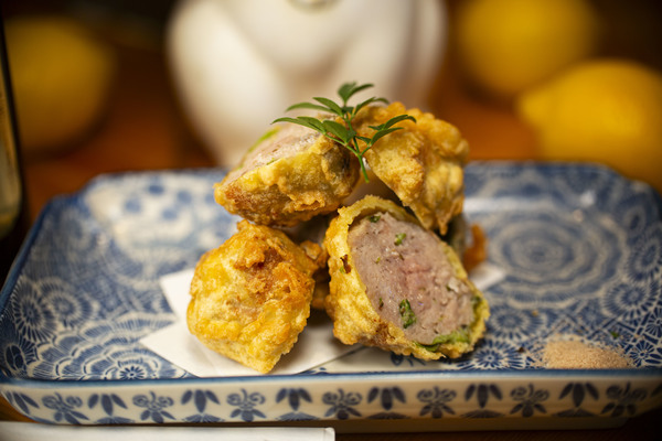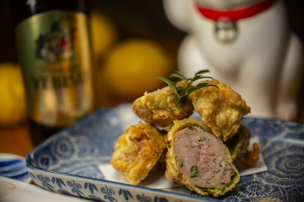 つぼみの部分を刻んでひき肉と合わせ、中に丁寧に詰めました。爽やかな香り、青々とした、鼻に抜ける爽快な風味、苦味と香りが醸し出す、深みのあるおとなの味わい。シンプルが美味い!サクッとジューシー!ヱビスビールにぴったり合うと思います!ぜひぜひお待ちしております!