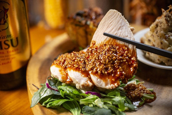 蒸し鶏のピリ辛黒酢ソースは、低温調理で柔らかく仕上げた国産鶏胸肉に、今回の逸品グランプリのためだけに作ったオリジナルの自家製ピリ辛黒酢ソースをかけたビールがすすむ逸品です。