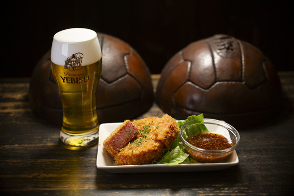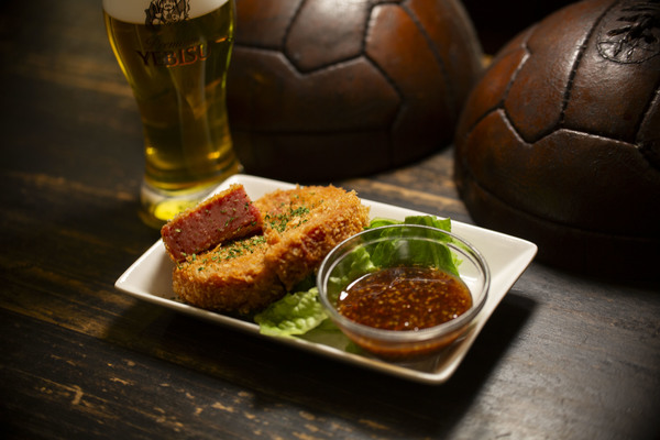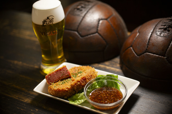パブでスポーツを観戦しながら皆でワイワイとビールを飲むのがイギリスやアイルランドではポピュラーな飲み方。そんな雰囲気が楽しめるのが「フットニック」。レイさんの作る今回の逸品は「スパムカツ」。甘めのマスタードソースと塩気が強いスパムをカツに。ヱビスでグイっと洗い流せば無限のループ。