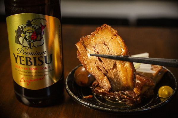 恵比寿駅前商店街アーケードで朝までやっているみんな頼りにしている「和顔」さんの支店がアメリカ橋を渡ってすぐ右に下る坂(カレー屋ボンベイ臭のする坂)の途中に出来ました!今回は溜まり醤油を使用したコクのある豚の角煮とヱビスの小瓶で楽しんでください^^